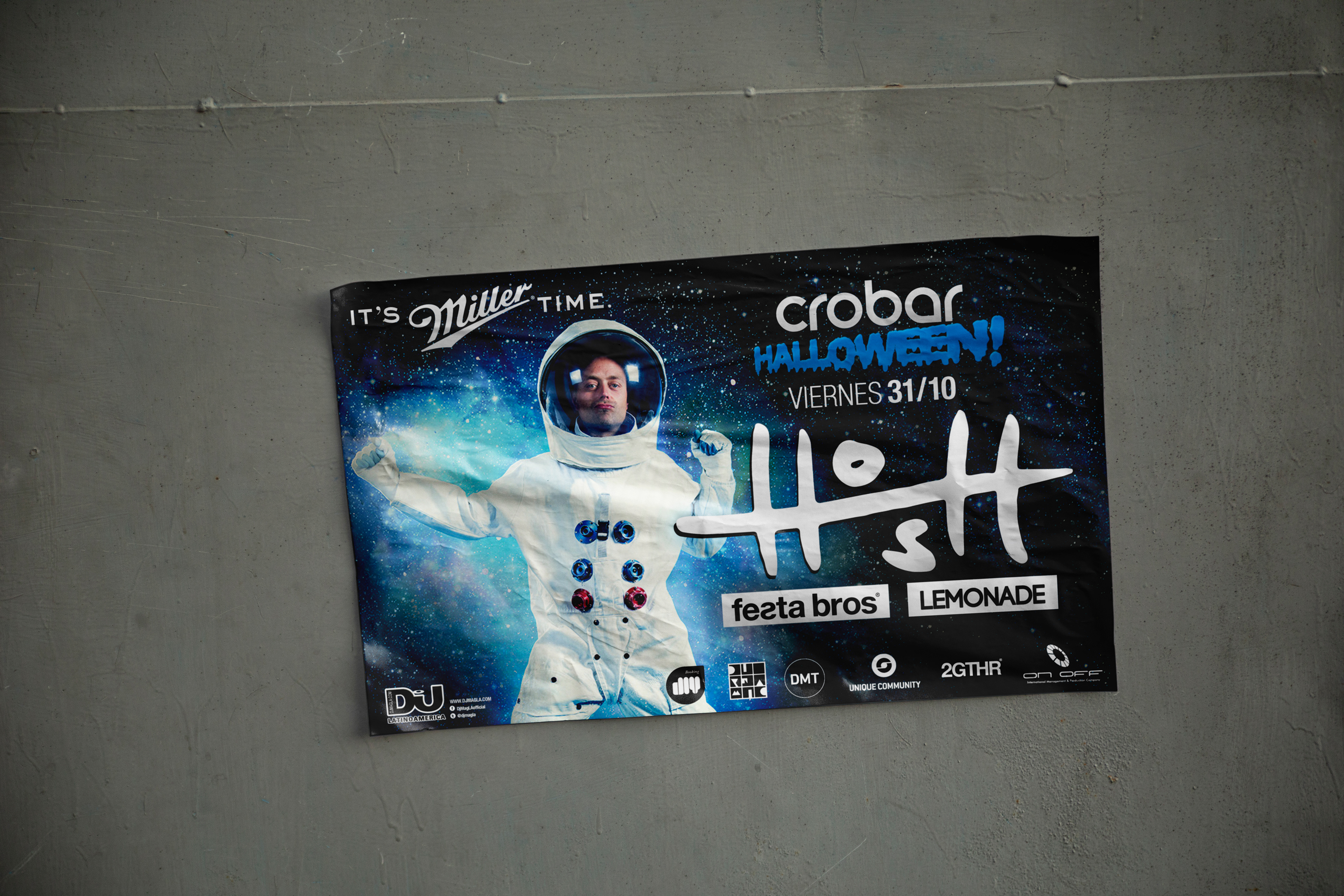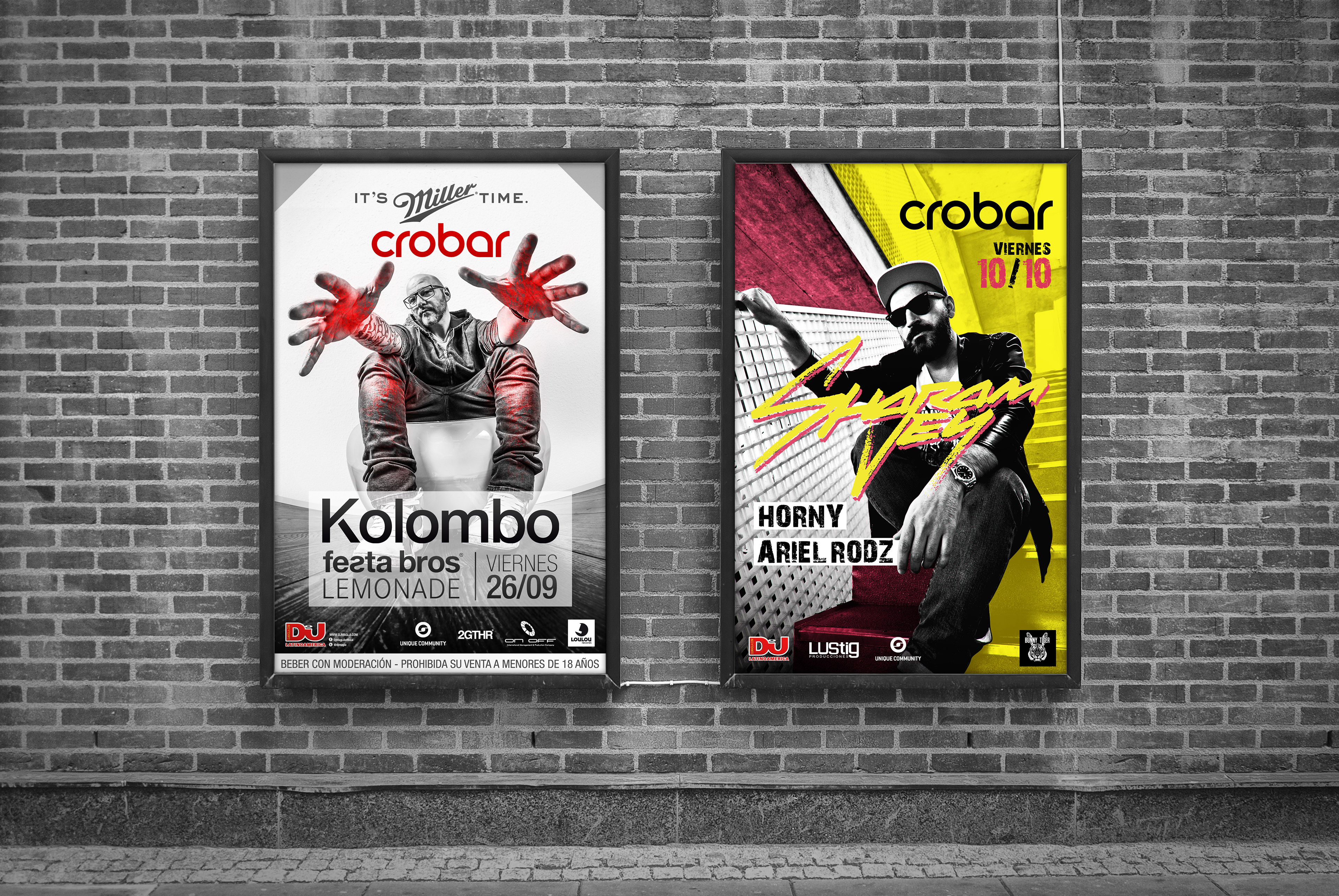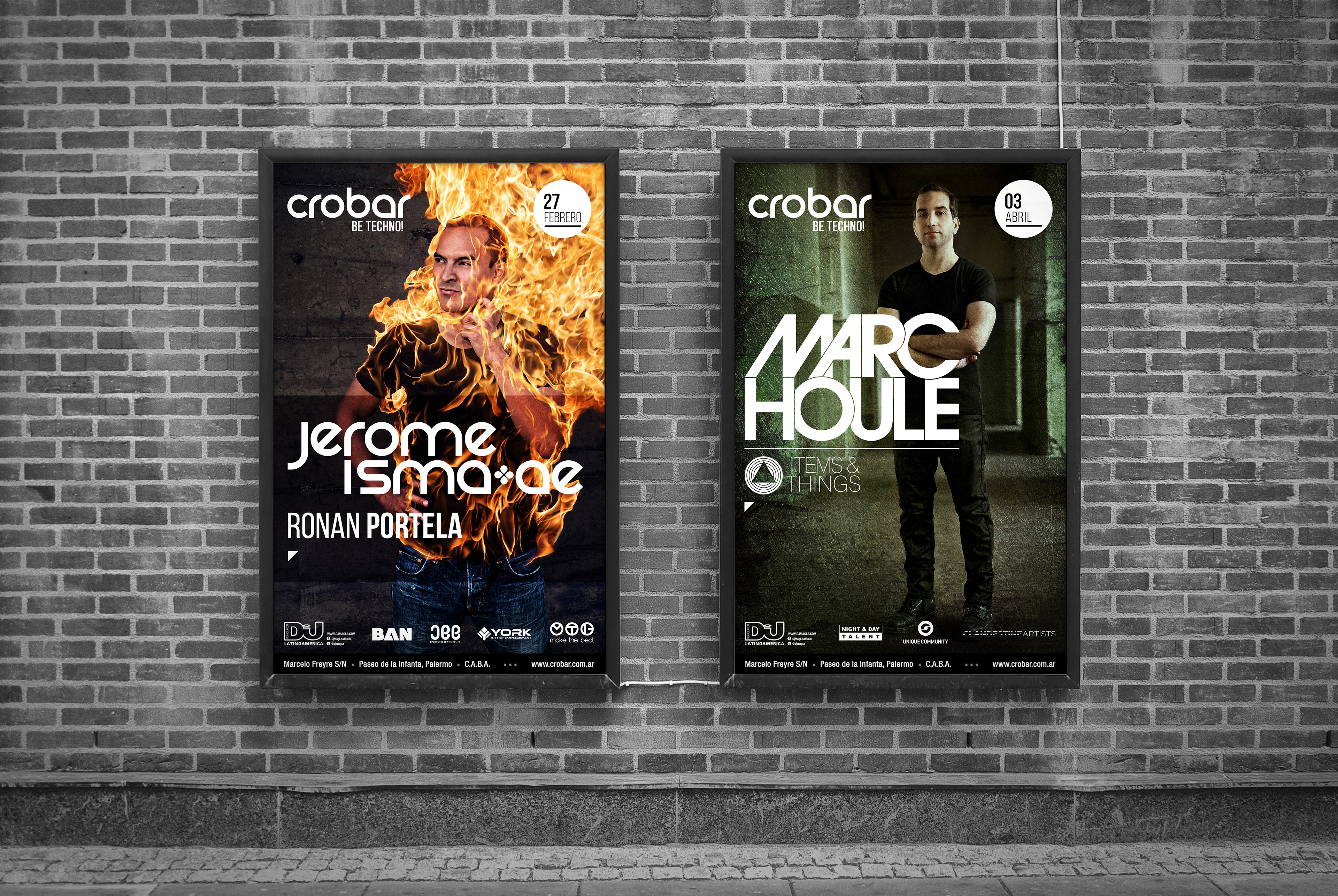 Design of flyers, website, and promotional material for Crobar nightclub. Artists included Kolombo, Sharam, Hosh, Jerome Isma-Ae, and Marc Houle. Produced in 2014–2015 for one of Buenos Aires’ premier techno venues.